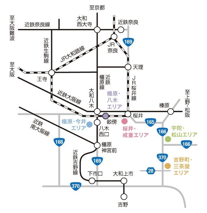 近鉄大阪線「大和八木駅」より徒歩9分、近鉄橿原線「八木西口駅」東出口より徒歩5分